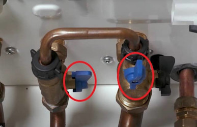 - Ensure both handles are in a closed position. You will know that they are both off if they are NOT in line with the piping (see image).